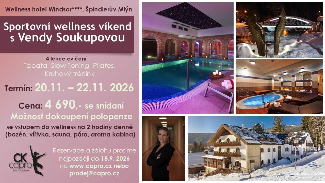 Přijeďte si užít víkend plný pohybu, relaxace a horské atmosféry do jednoho z nejkrásnějších koutů Krkonoš. Čeká vás kombinace intenzivního cvičení, regenerace ve wellness a pohodového času v elegantním prostředí hotelu Windsor**** přímo v centru Špindlerova Mlýna.